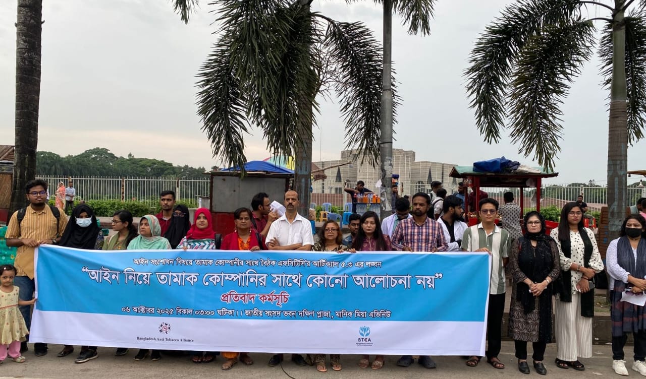 সোমবার (৬ অক্টোবর ২০২৫) বিকেল ৩টায় রাজধানীতে “আইন নিয়ে তামাক কোম্পানির সাথে কোনো আলোচনা নয়” প্রতিপাদ্য নিয়ে বাংলাদেশ টোব্যাকো কন্ট্রোল এডভোকেডস (BTCA) ও বাংলাদেশ তামাক বিরোধী জোট (BATA)-এর যৌথ উদ্যোগে এই প্রতিবাদ কর্মসূচি অনুষ্ঠিত হয়।