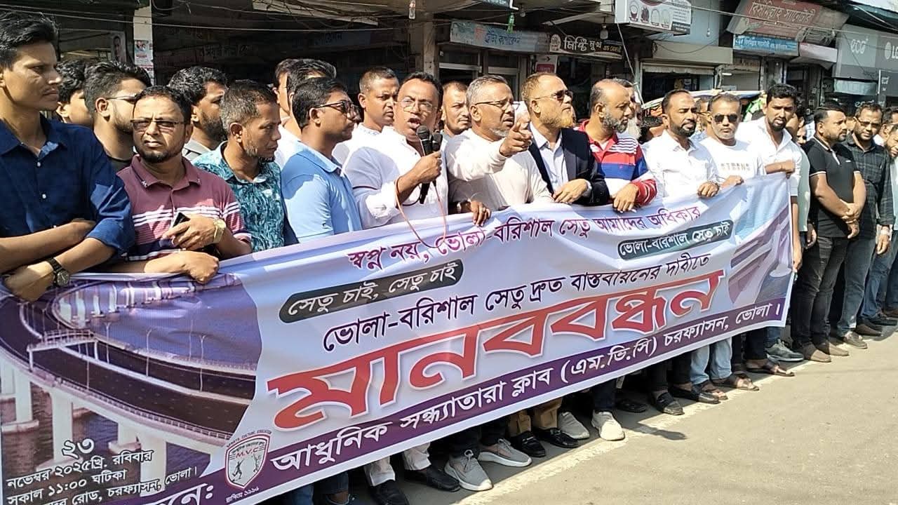 বক্তারা বলেন, ভোলা বাংলাদেশের একমাত্র বিচ্ছিন্ন দ্বীপ জেলা। এখানে প্রাকৃতিক গ্যাস, মাছ, কৃষি ও পর্যটনের অপার সম্ভাবনা থাকলেও সেতুর অভাবে বিনিয়োগ ও শিল্প উন্নয়ন ব্যাহত হচ্ছে। দীর্ঘদিন ধরে দাবি জানানো হলেও সরকার দৃশ্যমান কোনো উদ্যোগ গ্রহণ করেনি। সম্প্রতি যোগাযোগ উপদেষ্টার ‘ভোলা–বরিশাল সেতু হচ্ছে না’ মন্তব্যে দ্বীপবাসীর মধ্যে তীব্র ক্ষোভ সৃষ্টি হয়েছে।