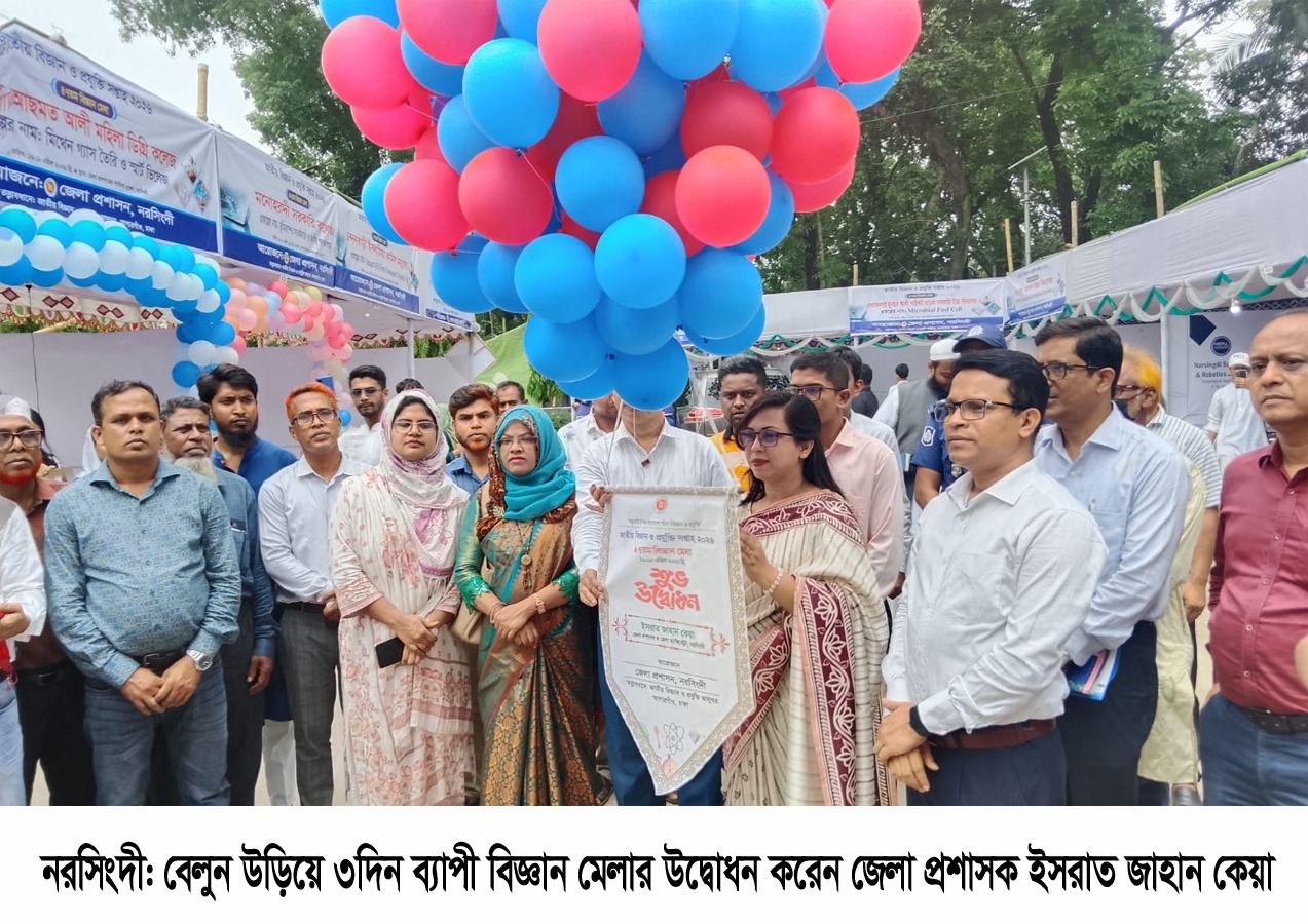 নরসিংদী প্রতিনিধি : নরসিংদীতে তিন দিনব্যাপী ৪৭ তম জাতীয় বিজ্ঞান মেলা ও প্রযুক্তি সপ্তাহ-২০২৬ এবং ১০ম গণিত অলিম্পিয়ার্ড এর উদ্বোধন করা হয়েছে| গতকাল বৃহস্পতিবার নরসিংদী জেলা প্রশাসক চত্বর প্রাঙ্গনে এ মেলার উদ্বোধন করেন নরসিংদী জেলা প্রশাসক ও বিজ্ঞ জেলা ম্যাজিস্ট্রেট ইসরাত জাহান কেয়া|