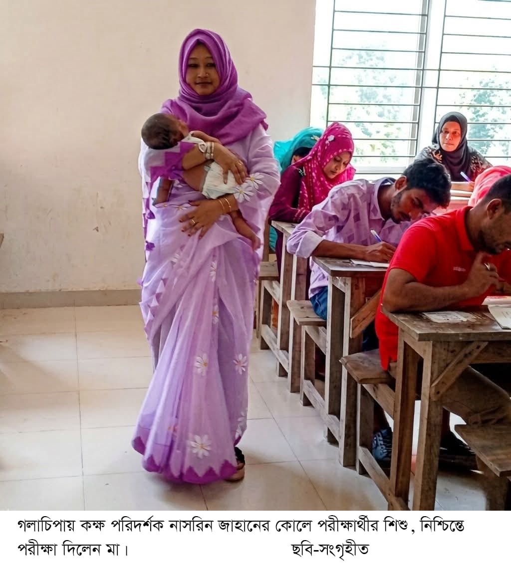 জানা যায়, ছোট শিশুকে নিয়ে পরীক্ষা কেন্দ্রে আসেন ওই পরীক্ষার্থী। শিশুটিকে দেখ ভাল করার কেউ না থাকায় বিপাকে পড়েন তিনি। বিষয়টি বুঝতে পেরে কক্ষপরিদর্শক নাসরিন জাহান শিশুটিকে নিজের কোলে নিয়ে যত্ন করেন। ফলে নির্বিঘ্নে পরীক্ষায় অংশ নিতে পারেন ওই মা।