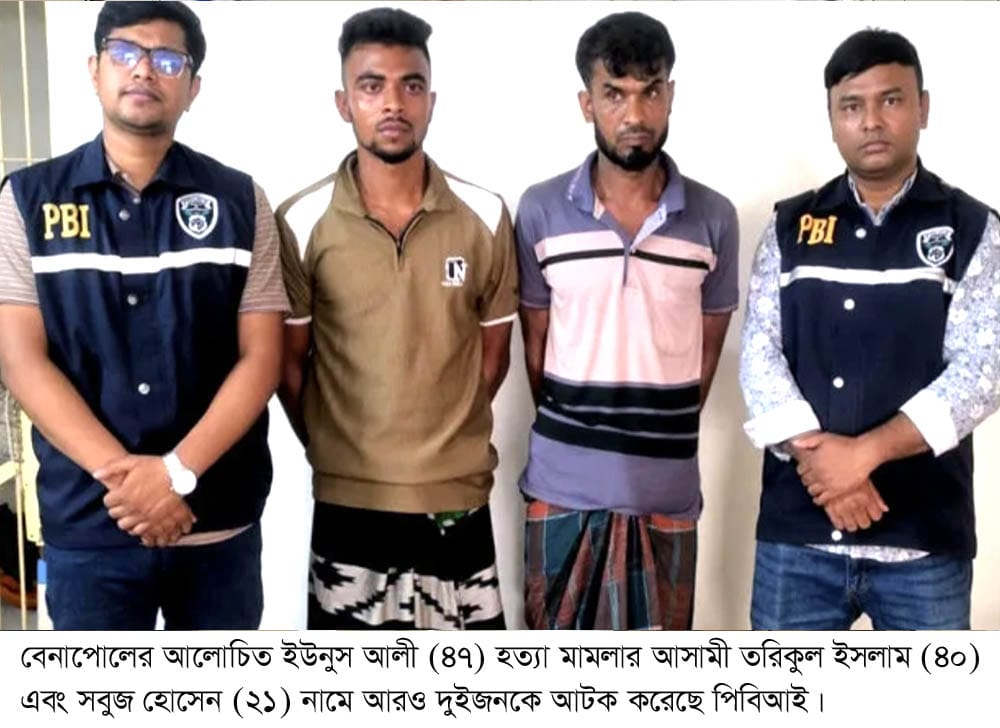 মসিয়ার রহমান কাজল,বেনাপোল: বেনাপোলের আলোচিত ইউনুস আলী (৪৭) হত্যা মামলার আসামী তরিকুল ইসলাম (৪০) এবং সবুজ হোসেন (২১)নামে আরও দুইজনকে আটক করেছে পুলিশ ব্যুরো অব ইনভেস্টিগেশন (পিবিআই)।